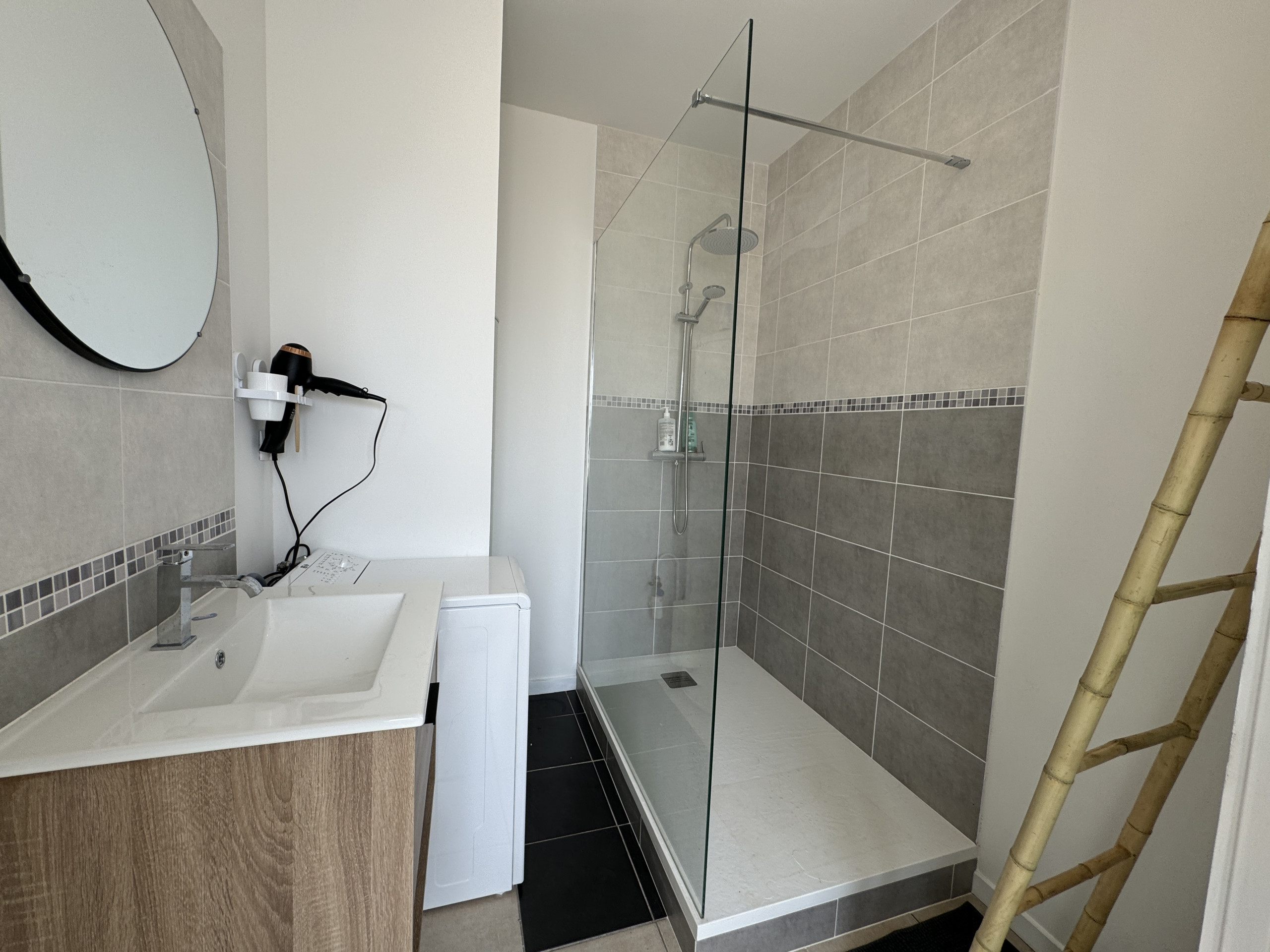 - **Modern bathroom** with **walk-in shower**, **washing machine** and **hair dryer**