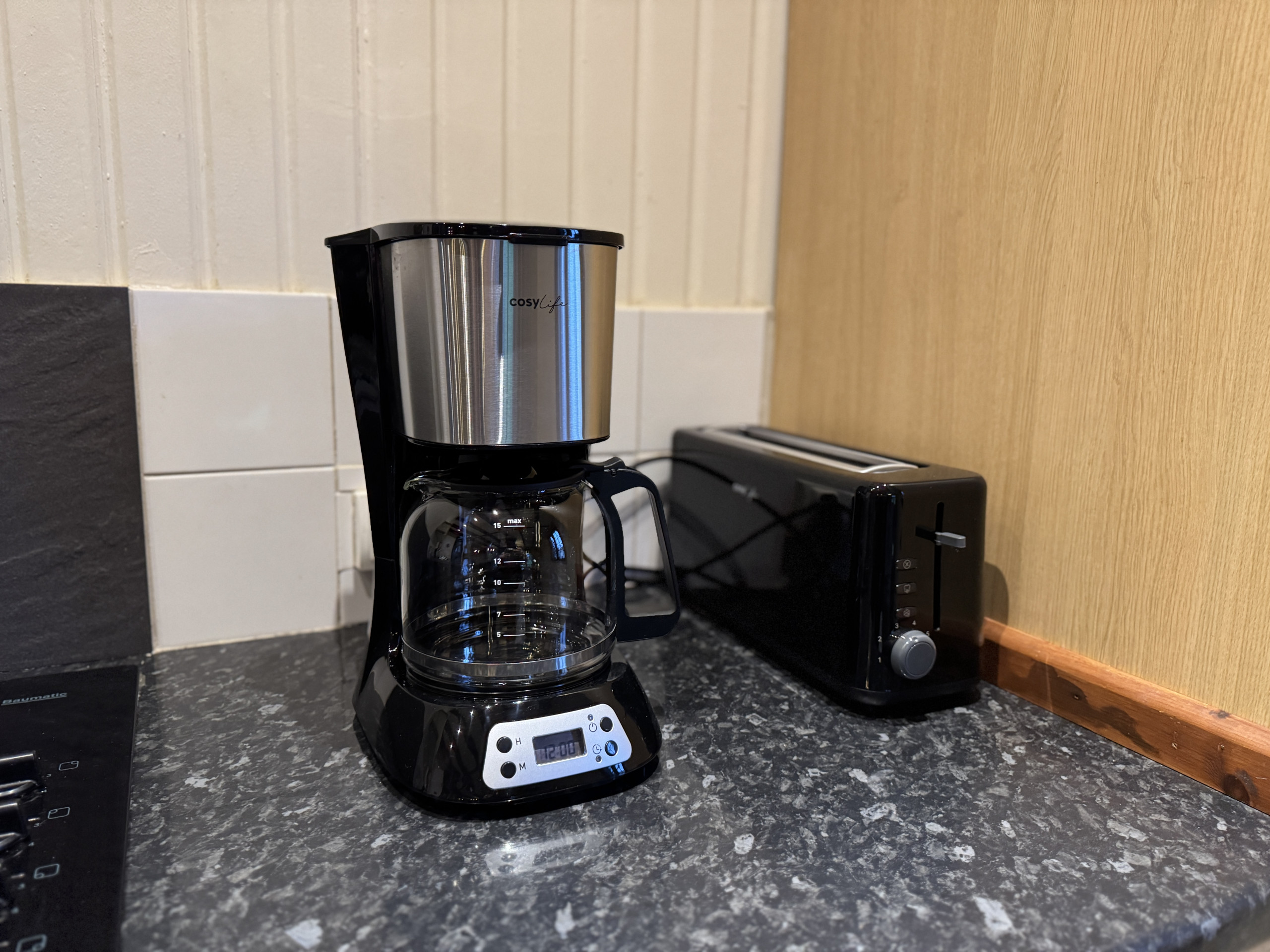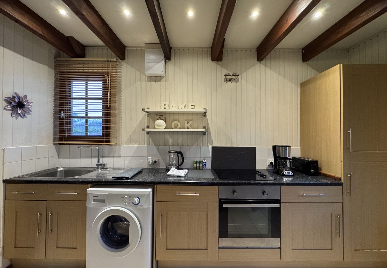 Cuisine américaine moderne, entièrement équipée avec réfrigérateur, four, congélateur, lave-vaisselle, vaisselle, ustensiles de cuisine, cafetière, grille-pain et bouilloire, pour des repas faits maison.