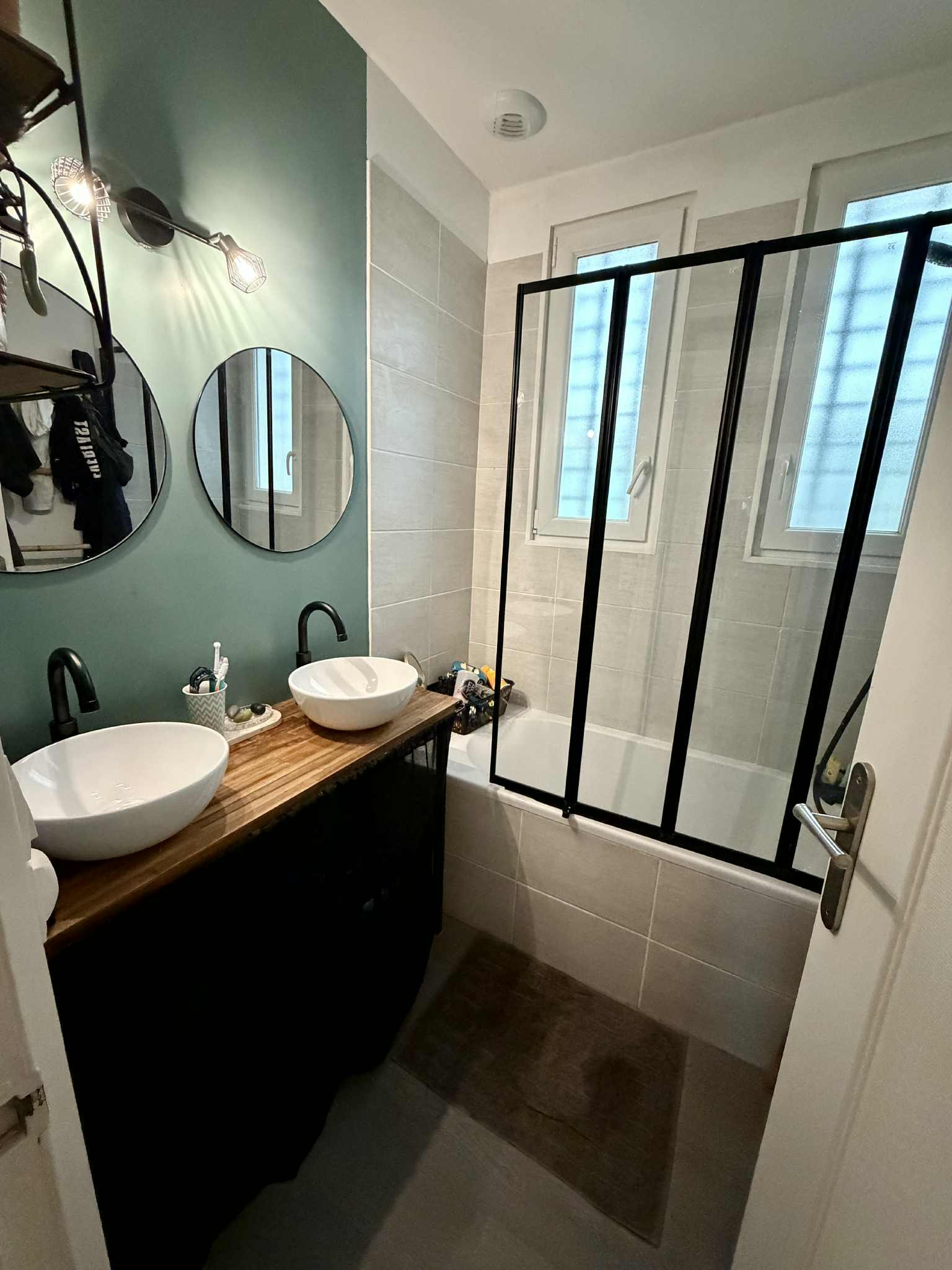 - **Salle de bain moderne** avec **douche à l’italienne**, **machine à laver** et **sèche-cheveux**