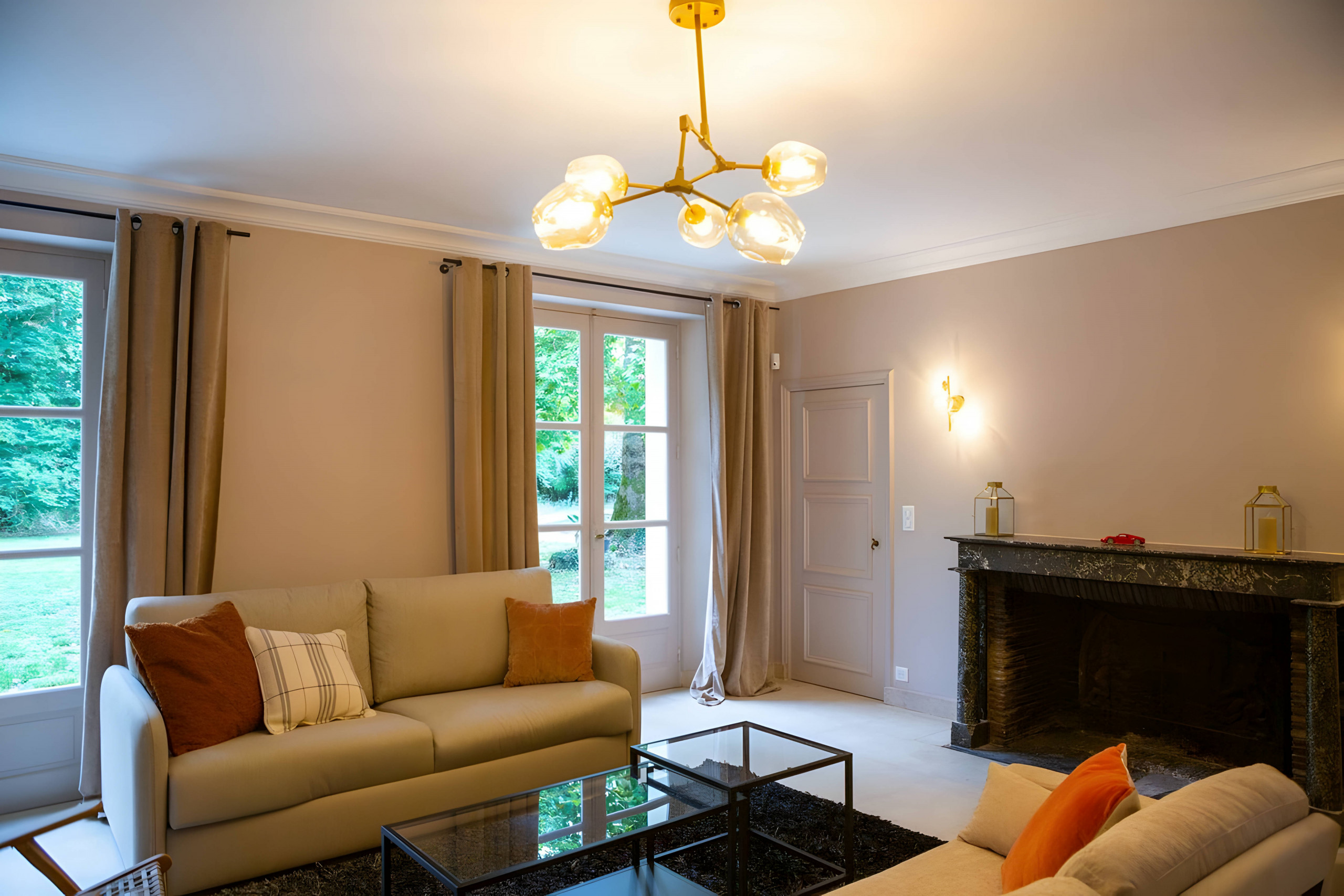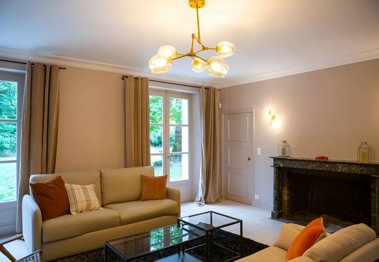 🔥 Salon chaleureux avec cheminée, idéal pour se détendre après une journée bien remplie